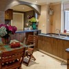 几何线条勾勒出了简约有层次的客厅吊顶,铁艺吊灯搭配,恰当好处,灯带及射灯搭配,弥补了室内光线不足,与吊灯搭配,营造出了温馨柔和的家居氛围,与美式乡村风格不谋而合。仿木纹墙纸贴饰而成的电视背景墙,灯光点缀,简洁明快富有动感,仿古砖朴实的质地加上亚光表面,最适合美式乡村风格的家居中,纯色布艺沙发,厚厚的坐垫及靠包设计,给人慵懒舒适之感,让人一坐下就舒服的不想再起来。砖砌半墙沙发背景墙设计,体现着乡村风格质朴与自然,沙发后面便是办公区,而半墙造型设计,既划分了两个区域,有不影响整个空间设计给人宽敞明亮的感觉。挂壁式的书桌,简约朴素,办公区墙面设计,是本案的一大设计亮点。多种多样的照片贴在棕色的墙面上,看似无序实则有序,随意却不显凌乱,让人眼前一亮,也给人很温馨的感觉。